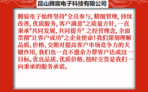 昆山騰宸電子科技有限公司位于中國線路板加工之都昆山千燈,公司專注于電路板研發(fā)設計、PCB抄板、元器件采購、SMT貼片加工、組裝測試,為客戶提供一站式電子制造服務。騰宸電子始終堅持"全員參與,精細管理,持續(xù)改善,優(yōu)質(zhì)服務,客戶滿意"之質(zhì)量方針,一直秉承"共同發(fā)展,共同提升" 之經(jīng)營理念,全面貫徹"讓客戶成功"之企業(yè)使命!我們深刻理解品質(zhì)、價格、交期對提高客戶市場競爭力的關(guān)鍵作用,我們也一直不遺余力幫客戶達成這一目標。優(yōu)良品質(zhì)、優(yōu)質(zhì)價格、按時交貨是我們一向秉承的服務承諾。 ...